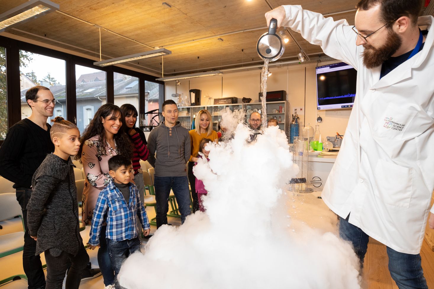 Cet atelier est entièrement consacré aux liquides. L’excitation est garantie au laboratoire Fluide ! Qu'il s'agisse de températures extrêmement basses, des différents états des composants de l'air (gaz, liquides ou solides), ou d'expériences à basse pression et sous vide, les secrets de la science ne resteront plus longtemps cachés.